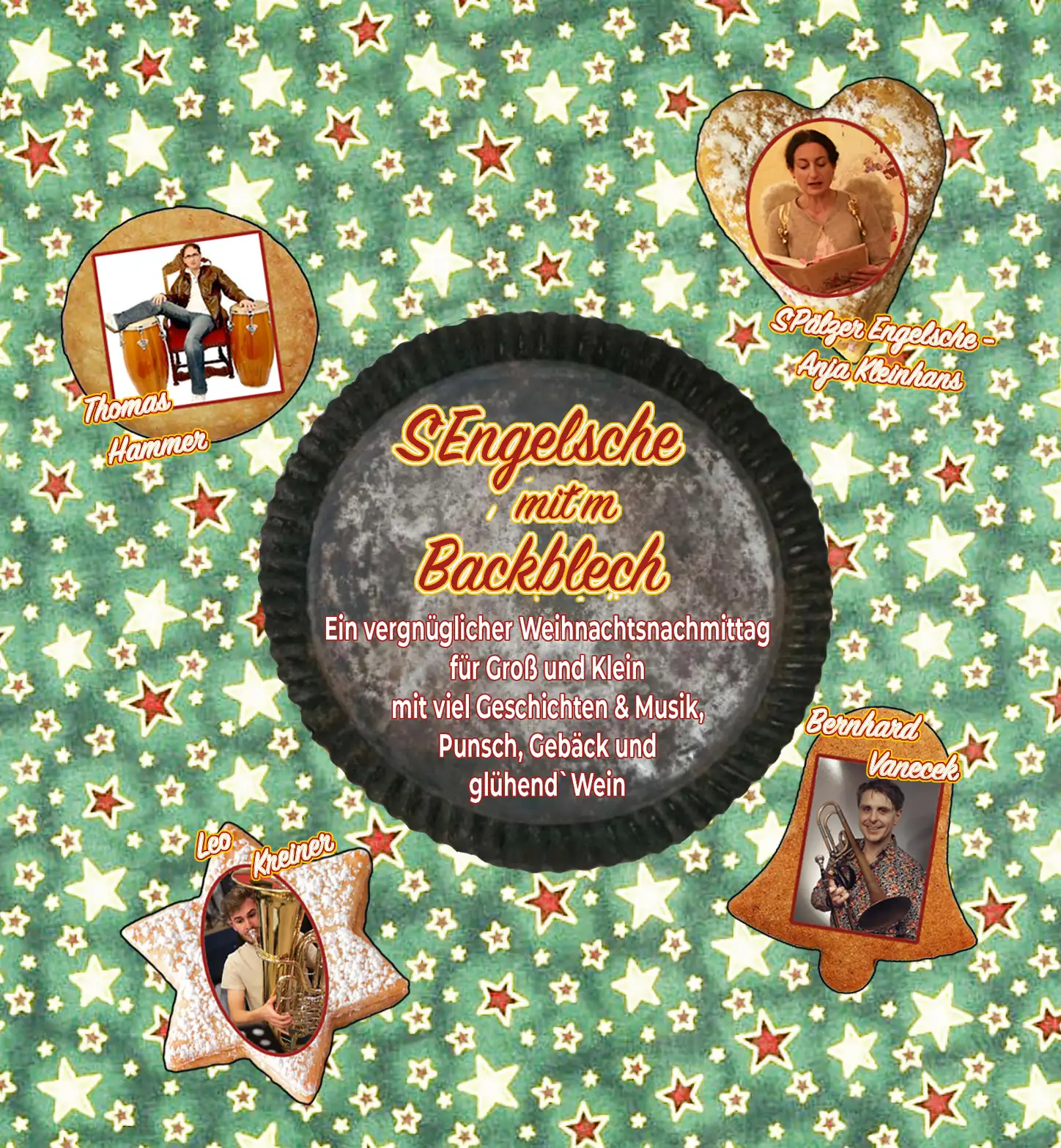 Ein vergnüglicher Weihnachtsnachmittag für Groß und Klein mit viel Geschichten & Musik, Punsch, Gebäck und glühend` Wein. Mit dem Jazztrio „Backblech“: Bernhard Vanecek (Posaune), Thomas Hammer (Drums) , Leo Kleiner (Tuba) und dem „Pälzer Engelsche“: Anja Kleinhans.